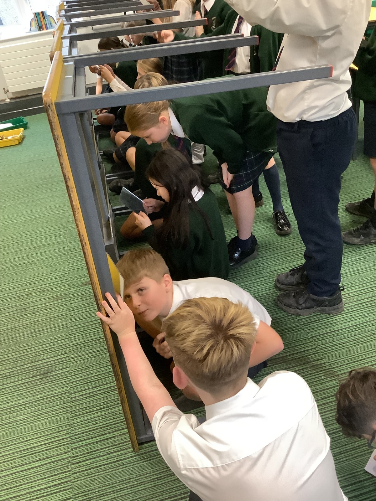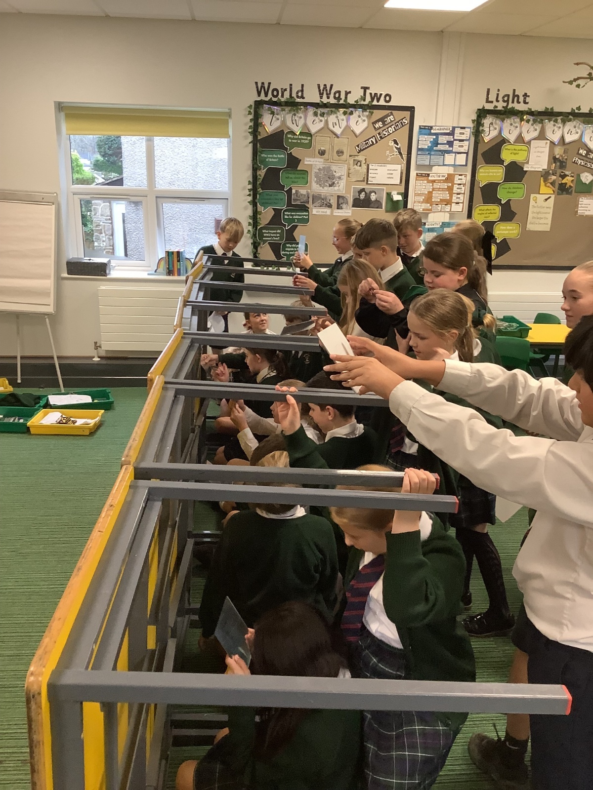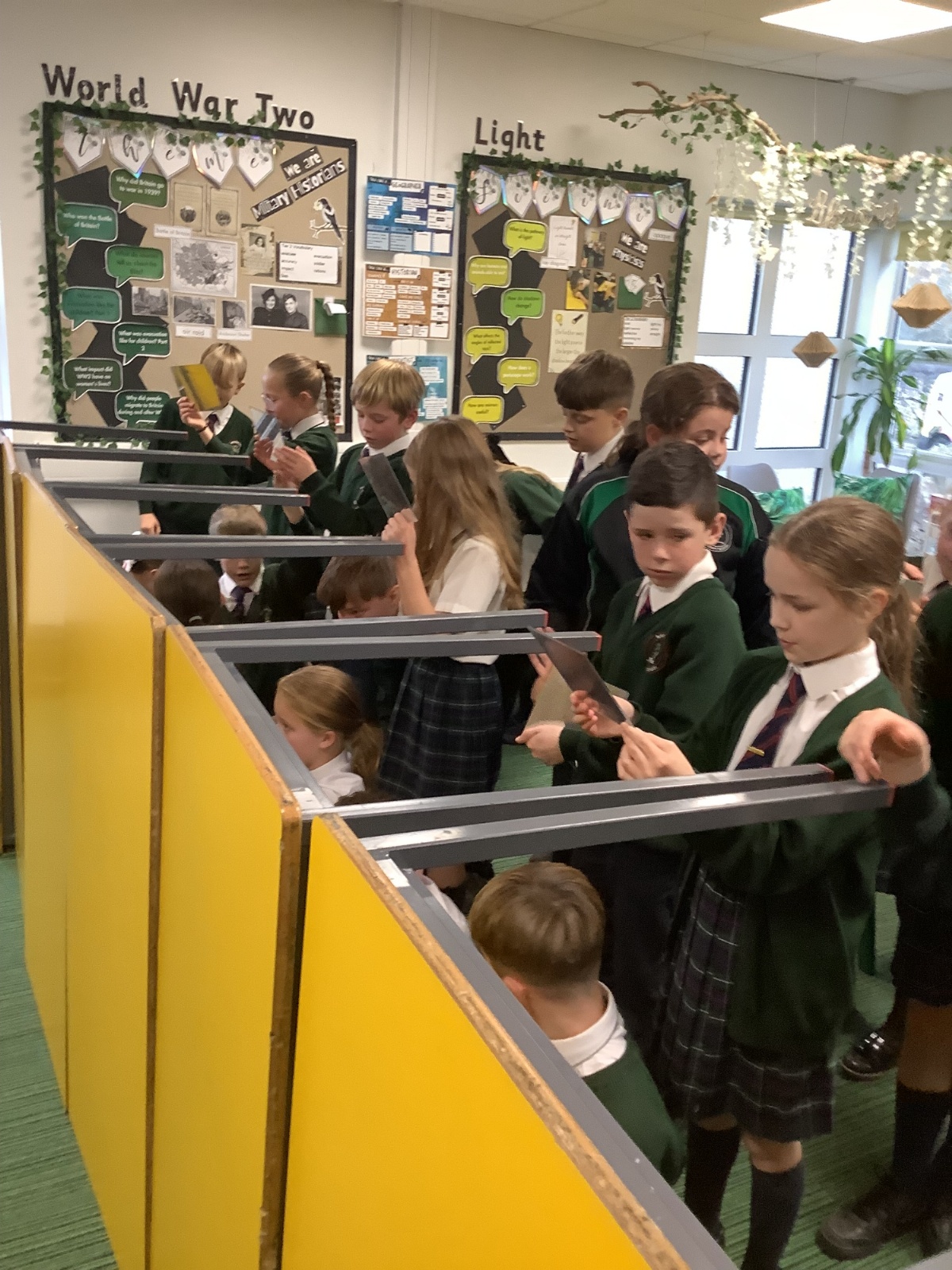 Year 6 learnt all about how periscopes work. They linked this to their learning in History and discussed how people saw enemies when in WW1 and WW2 trenches. The children worked in groups to angle the mirrors so the soldiers could read the secret codes and pass them on to the person recording the codes.