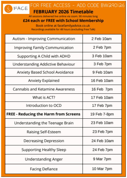 This can be used by any parents or staff from our school for unlimited access to all the regular FACE Parent Talks (usually £24 each). The code cannot be used on any other FACE services and must not be shared with parents or staff from other schools.