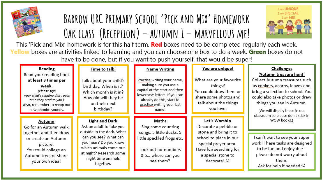 At the start of each half term, your child's class teacher will share a 'Pick n Mix Homework Menu'. This will be based on the topic and units that your child is covering that half term. Please record all homework in your child’s WOW book and return to school every Monday.