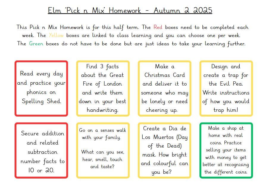 At the start of each half term, your child's class teacher will share a 'Pick n Mix Homework Menu'. This will be based on the topic and units that your child is covering that half term.